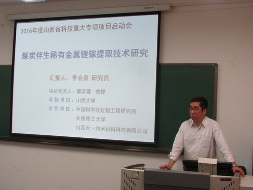 5月9日下午,”2016年度山西省科技重大专项“煤炭伴生稀有金属锂镓提取技术研究”项目启动会暨2017年学术交流会”在bet365服务电话二层会议室举行。该项目为山西大学承担,中国科学院过程工程研究所、太原理工大学、山西天一纳米材料科技有限公司联合参加的2016年度山西省煤基低碳科技重大专项项目。山西省科技厅重大办彭德全处长应邀出席了启动会,各参与单位包括中国科学院过程工程研究所、太原理工大学、山西大学及山西天一纳米材料科技有限公司的课题负责人及研究骨干项目参加了启动会。项目负责人山西大学郭彦霞教授主持了此次会议。