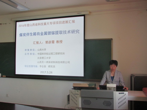 在会上,郭彦霞教授关于煤炭伴生稀有金属锂镓提取技术研究做了报告,对此专项项目的项目分工、项目进展、经费分配以及保障措施做了详细汇报。项目检查组对郭彦霞教授的汇报予以了极高的肯定,并对项目在近半年来执行和管理的顺利情况表示欣慰。会上,各方专家就锂、镓提取工艺、吸附材料研究以及产品成本核算做了详细讨论。会议强调,必须要严格分配、管理和监督项目经费,保证科学合理地运用政府、社会等各方提供的资源,保证项目有条不紊地进行。